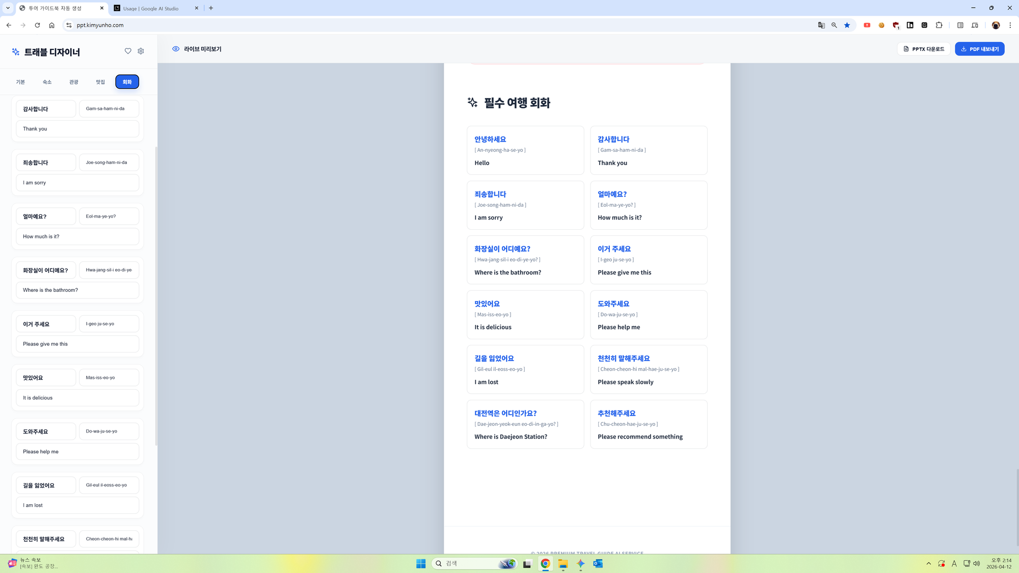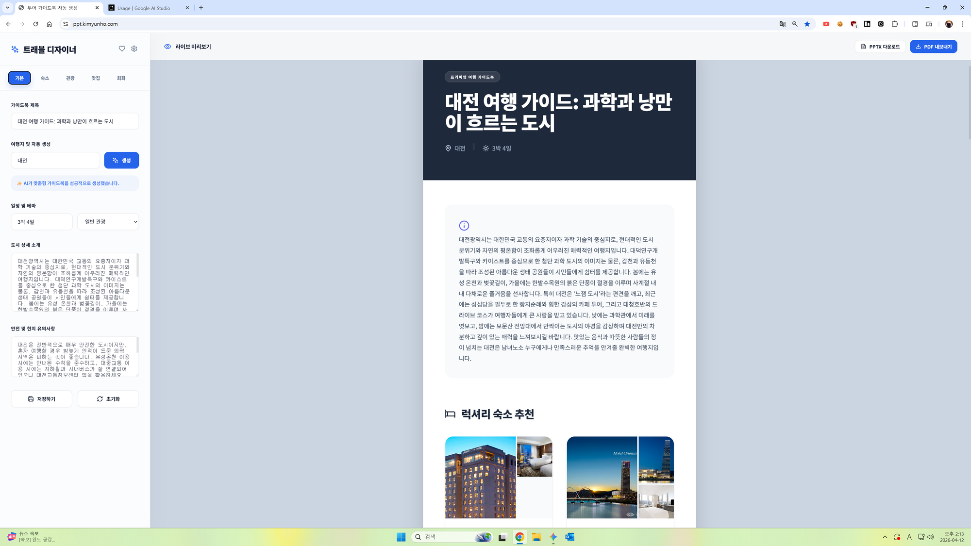 - 멀티 포맷 내보내기: 웹 브라우저에서의 확인은 물론, 프레젠테이션용 PPTX와 인쇄/전달용 PDF로 바로 다운로드할 수 있습니다.