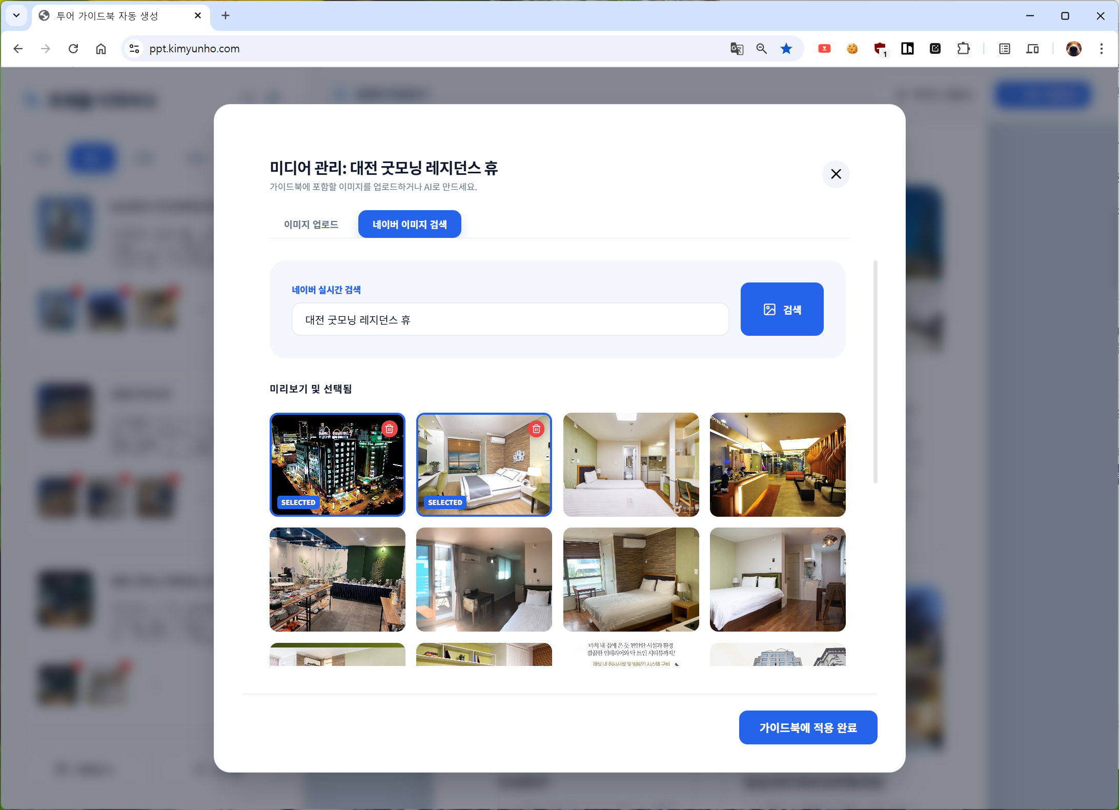 - 스마트 이미지 서칭 (Naver API): 장소명만으로 네이버 이미지 검색 결과를 불러와 별도의 탭 없이 즉시 가이드북에 삽입 가능합니다.